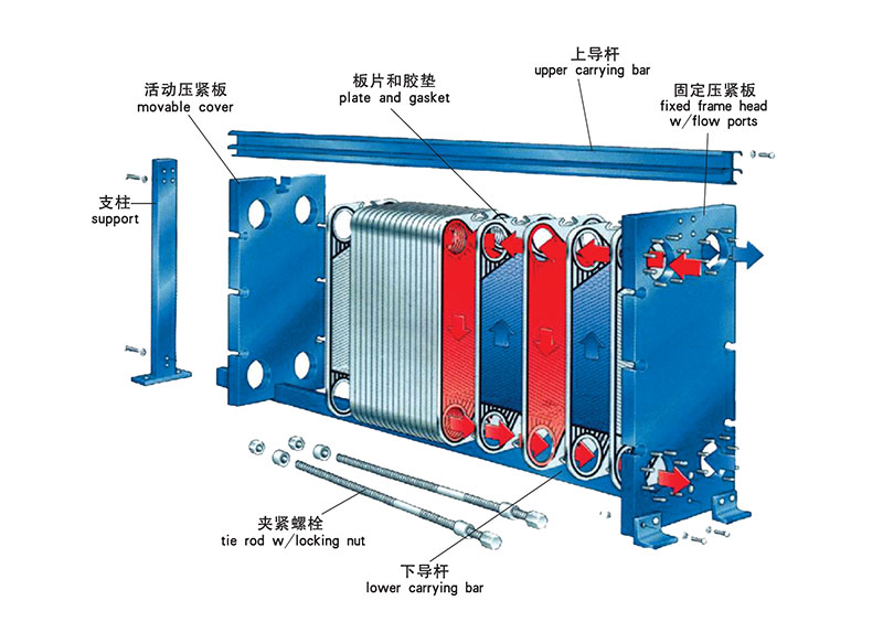 一、產(chǎn)品概述板式換熱器廣泛應(yīng)用于供熱取暖、熱水洗浴、空調(diào)、液壓油冷卻、石油化工、制藥、食品加工等領(lǐng)域。板式換熱器是目前各類換熱器當(dāng)中換熱效率很高的一種換熱器,它占用空間小,安裝拆卸方便。板式換熱器的結(jié)構(gòu)分解如圖1,主要部件是由換熱板片、密封膠墊、夾緊板、導(dǎo)桿、夾緊螺栓組成。換熱板片是由不銹鋼板壓制成型,它上面開有4個流道孔,中部壓成人字形波紋,四周壓有密封槽。密封槽內(nèi)粘有密封膠墊。換熱板片通過兩...